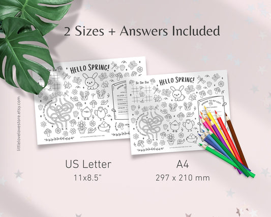 Spring games paper placemats for Kids | Puzzle & Coloring Activity